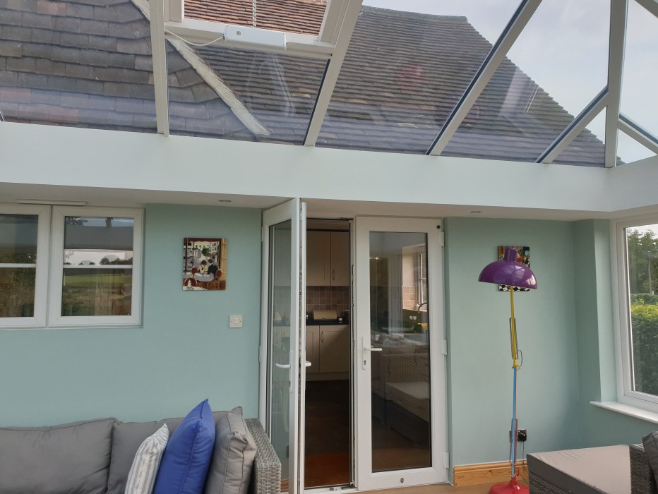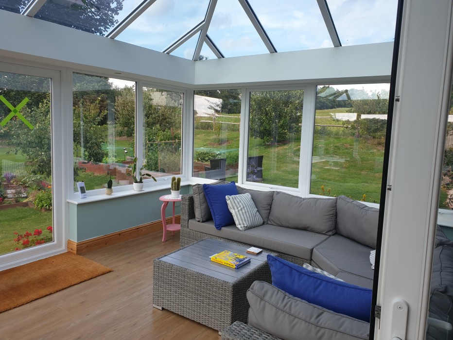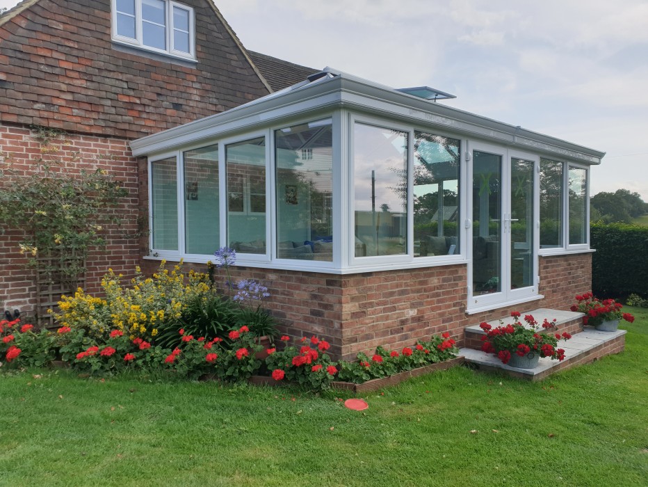 Our clients in Kent wanted somewhere to sit and enjoy their gorgeous garden and views all year round without having to worry about the British weather. We completed this conservatory build using the Durabase Steel base system, which is faster and cleaner than a conventional base system. Using the Ultraframe roof system, this customer added electric roof vents and an insulated pelmet to add thermal efficiency and an orangery feel inside. It's also a clever way of hiding lighting. Adding the decorative Cornice gutter outside gives a beautiful finish outside. With super-efficient glazing in the roof and frames and insulation in the floor, walls, and pelmet, combined with underfloor heating, this conservatory won't be too hot in the summer, or cold in the winter. Truly a place to relax with a good book or friends.
